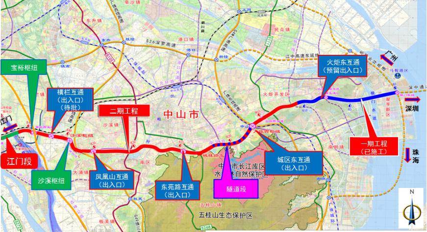 二期工程起于火炬開(kāi)發(fā)區(qū)大常山隧道,沿博愛(ài)路走廊在京珠高速節(jié)點(diǎn)轉(zhuǎn)至南外環(huán)路走廊,沿南外環(huán)路走廊向西跨越岐江河、G105后,轉(zhuǎn)至橫四線走廊(在建),跨越廣珠西線高速,與西部外環(huán)高速交叉后,在磨刀門水道接江門段。