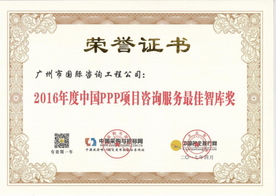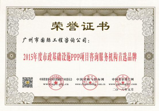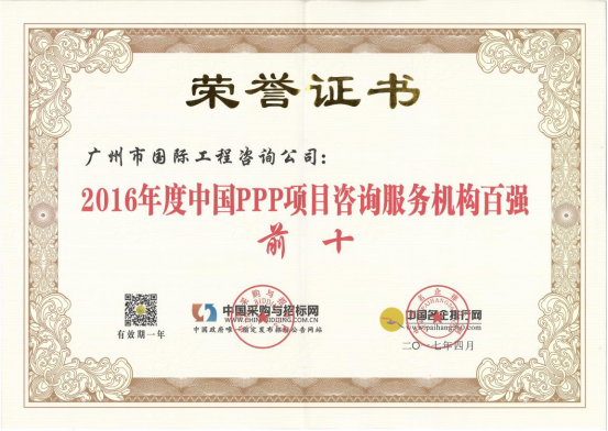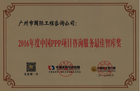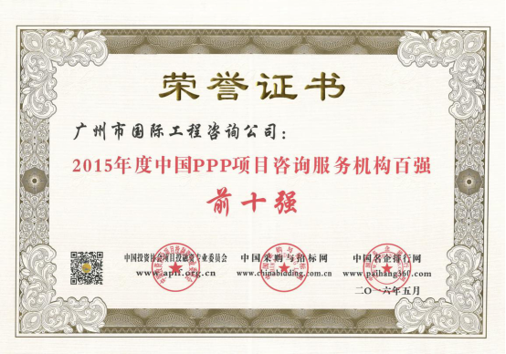 廣州市國際工程咨詢公司已連續(xù)兩年,蟬聯(lián)年度中國PPP項目咨詢服務機構十大頂級品牌等獎項。