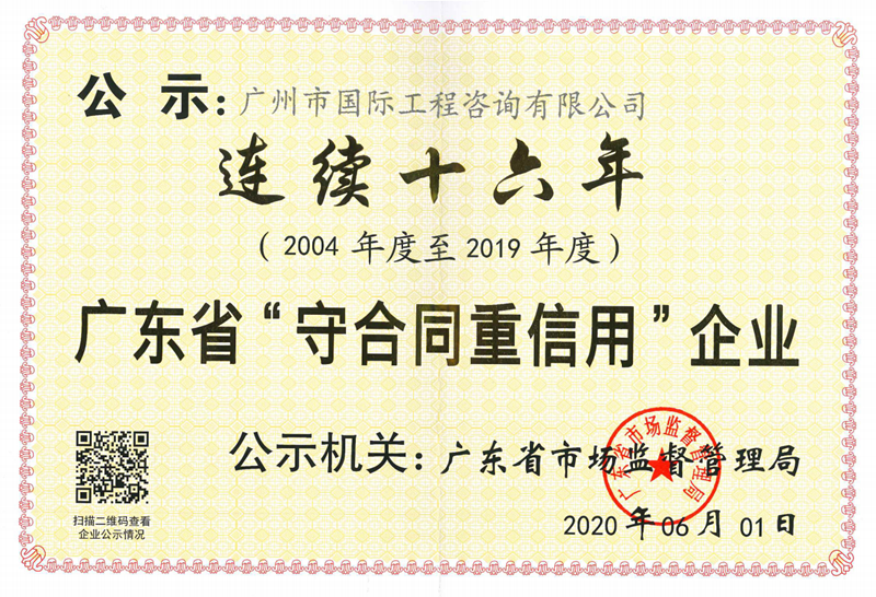 近日,廣州市國際工程咨詢有限公司順利通過廣東省市場監督管理局與廣州市市場監督管理局評審,榮獲“廣東省守合同重信用企業”稱號,這是自2004年以來,我司連續16年獲頒此殊榮,這也是我司多年守法經營,深入推動誠信建設、堅持誠信履約所取得的重要成果。