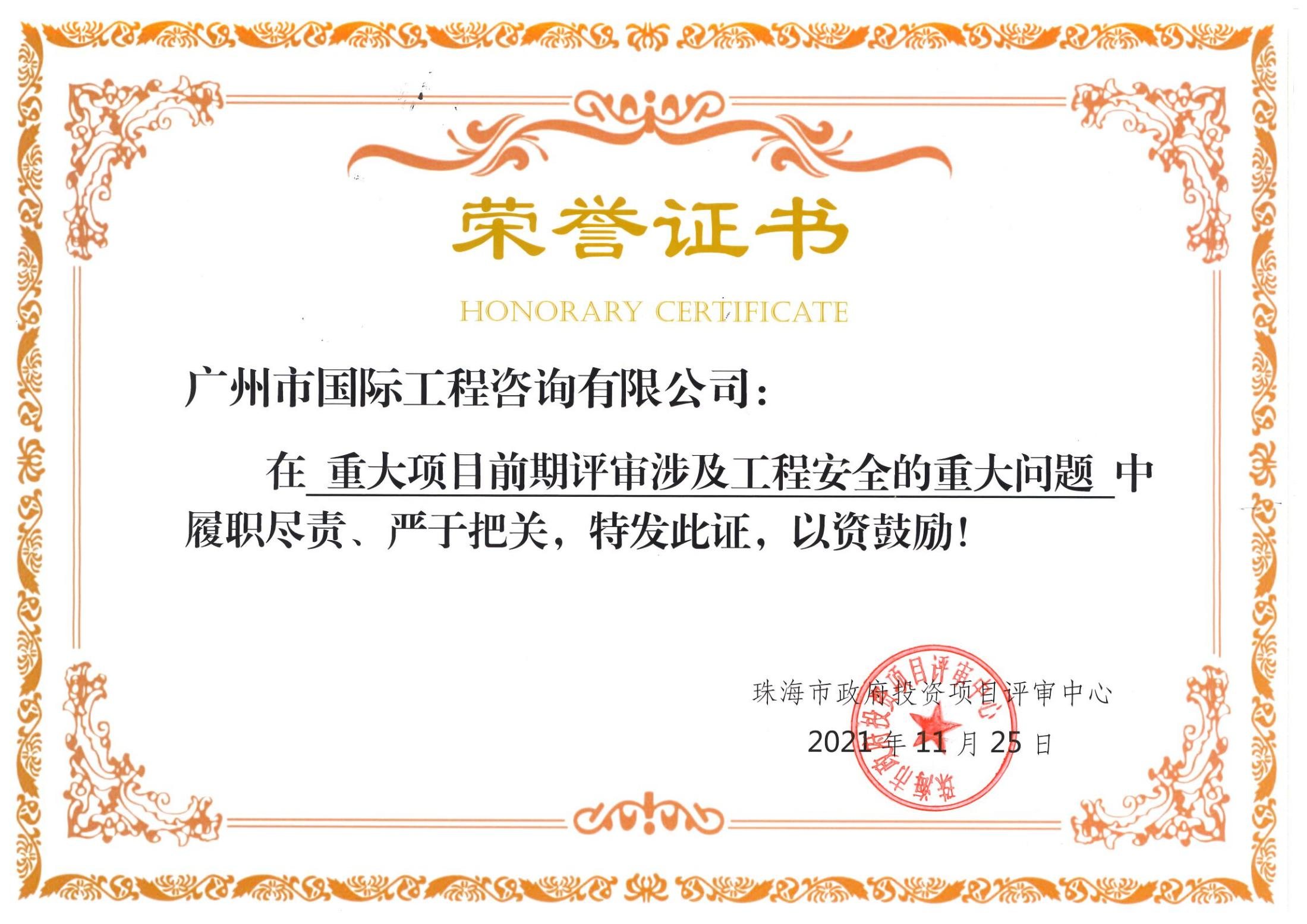 為貫徹落實《國家發(fā)展改革委關于加強基礎設施建設項目管理 確保工程安全質量的通知》(發(fā)改投資規(guī)〔2021〕910號),加強基礎設施建設項目安全質量管理,11月25日,珠海市政府投資項目評審中心主持召開了關于如何進一步加強項目前期評審工作的會議,珠海市發(fā)展和改革局、珠海市政府投資項目評審中心、廣州市國際工程咨詢有限公司及其他有關單位代表出席了會議,并對包括我司在內的一眾評審單位進行了表彰。