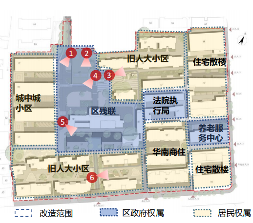 花都區舊人大小區建于80-90年代,小區改造用地面積約35800平方米,建筑總面積約65972平方米,樓棟數30棟,居民戶數719戶,無業委會與物業單位。小區地塊內部組成復雜,包括舊人大小區、城中城小區、區殘聯、法院執行局、舊人大辦公樓、華南商住、養老服務中心及住宅散樓等。花都區舊人大小區具有黨建文化氛圍濃厚、空間充足以及可利用資源基礎良好等優勢,適宜作為先行先試的示范項目。2021年3月經花都區政府同意確定將舊人大小區項目作為花都區老舊小區有機更新項目的示范區。項目實施內容主要包括新建立體機械停車樓、利用現狀閑置公房改造成鄰里中心、小區公共空間(美好會客廳)、兒童娛樂設施、信息標識、充電樁、危房加固、智慧設施及藝術彩繪。