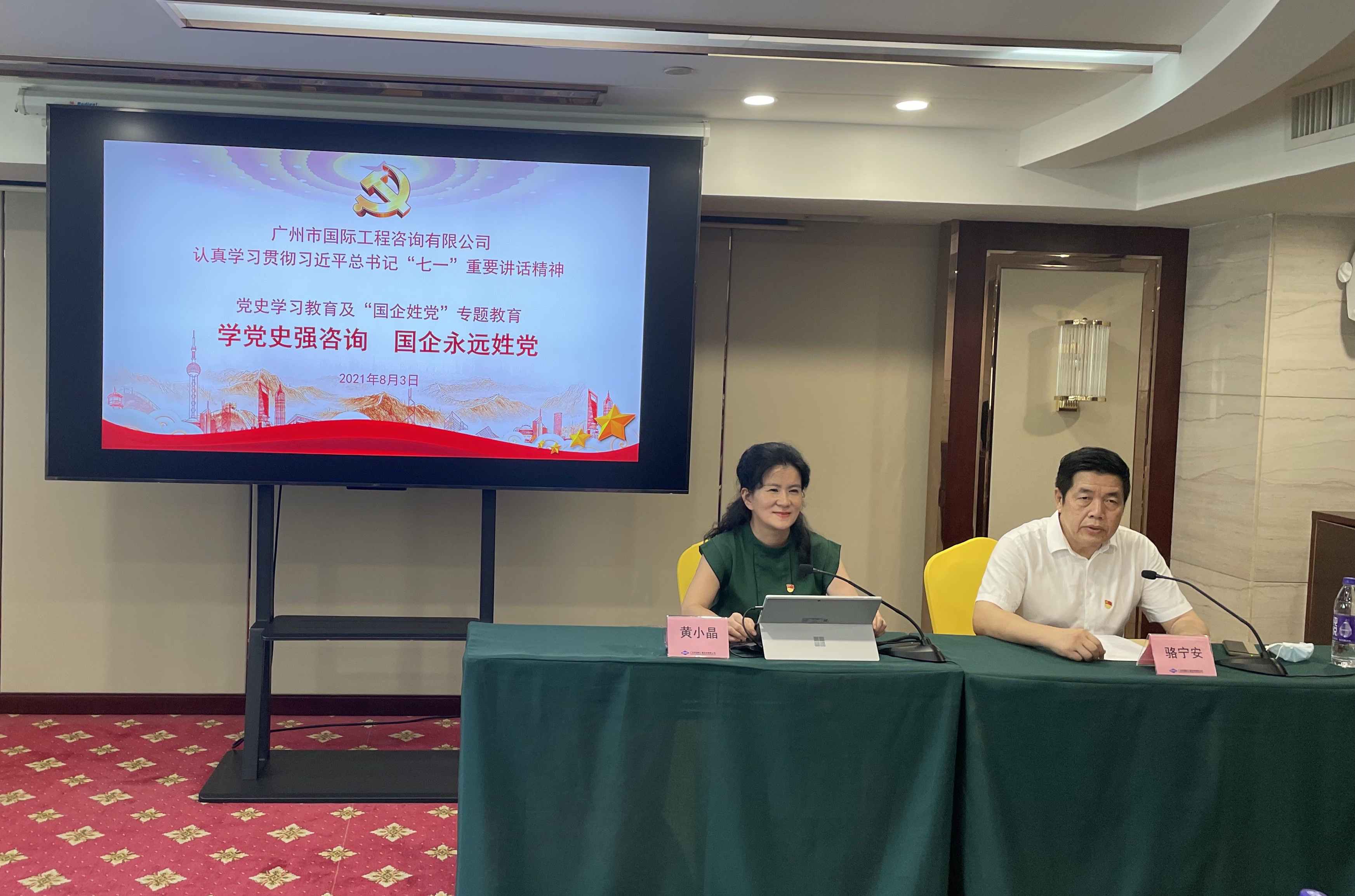 根據(jù)公司黨委黨史學習教育及開展“國企姓黨”專題教育工作安排,結(jié)合認真學習貫徹習近平總書記在慶祝中國共產(chǎn)黨成立100周年大會上重要講話精神工作要求,廣州市國際工程咨詢有限公司黨委迅速掀起學習宣傳貫徹熱潮,推動學習培訓全覆蓋,于8月3日邀請了市委黨史學習教育領導小組成員、市委講師團成員、中共廣州市委黨史文獻研究室(市人民政府地方志辦公室)黃小晶主任作《學黨史強咨詢 國企永遠姓黨》專題宣講。